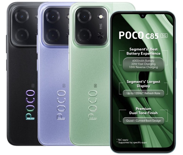 Poco C85 5G साइड फिंगरप्रिंट सेंसर और एआई फेस अनलॉक के साथ आता है। डुअल सिम सपोर्ट के साथ इसमें माइक्रो एसडी कार्ड की सुविधा भी है।