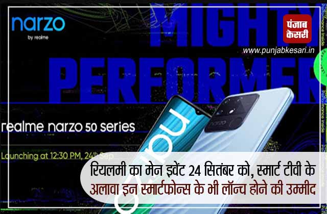 गैजेट डेस्क: रियलमी इंडिया 24 सितंबर को एक बड़े इवेंट का आयोजन करेगी, जिसमें कंपनी अपने कई प्रोडक्ट्स को एक साथ लॉन्च करेगी। रियलमी इस इवेंट के दौरान अपने Smart TV Neo के अलावा Narzo 50 सीरीज के स्मार्टफोन लॉन्च करने वाली है। इस नई सीरीज के तहत Realme Narzo 50, Realme Narzo 50 Pro और Realme Narzo 50A को लॉन्च किया जा सकता है। इस इवेंट का आयोजन वर्चुअली किया जाएगा।