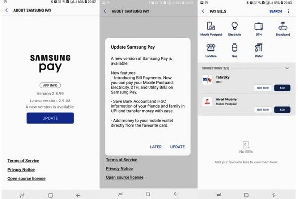 जालंधरः दक्षिण कोरियाई कंपनी सैमसंग ने इस साल मार्च महीने में सैमसंग Pay एप्प को भारत में लांच किया था। वहीं, अब कंपनी ने अपने एप्प के लिए एक नया अपडेट जारी किया है। इस नए अपडेट के बाद यूजर्स सैमसंग Pay से अपने महीने में आने वाले बिल जैसे- मोबाइल, बिजली, DTH या अन्य उपयोगिता (Utility) बिल का भुगतान कर पाएंगे।